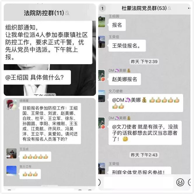 2月6日下午,杜尔伯特县法院防控群中显示了一条新信息为“为响应泰康镇(杜尔伯特镇)社区疫情防控需要,现选派4名党员志愿者”,消息刚挂出来,群里立即响起一声声回应“我报名”。这次志愿者征集工作,不到半小时就已有20多名党员加入了党员志愿者队伍。全体党员志愿者们听从指挥,随时待命,等到集结号的吹响。
