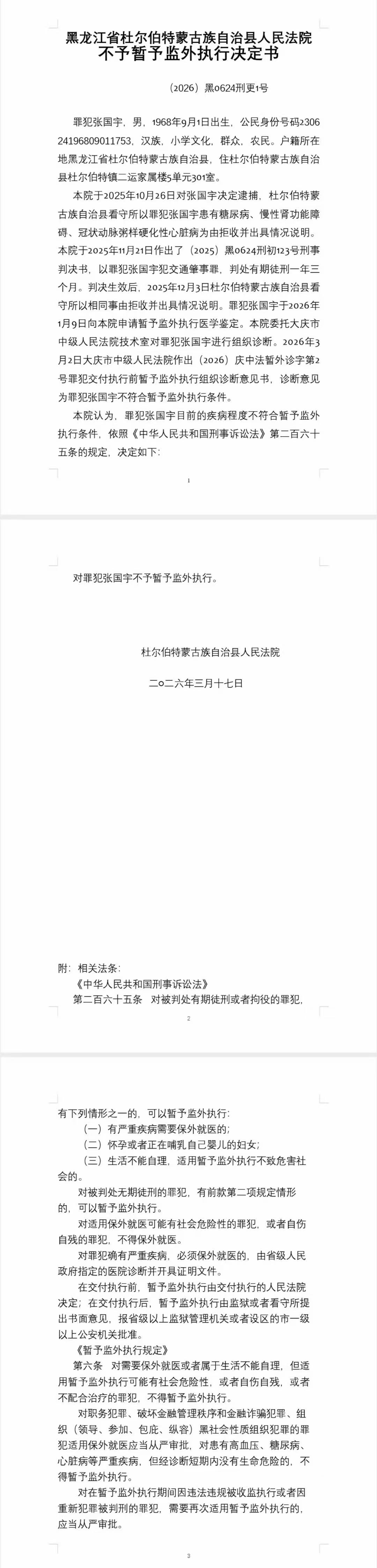 不予暂予监外执行决定书